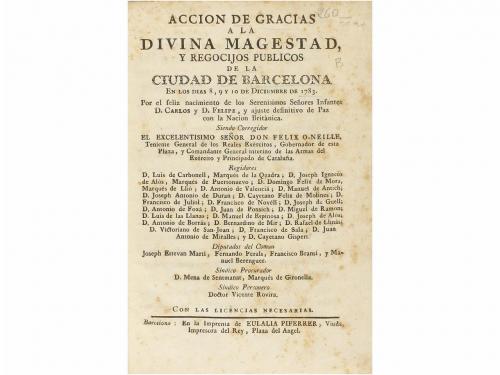 LIBRO. (BARCELONA). ACCION DE GRACIAS A LA DIVINA MAGESTAD Y REGOCIJOS PUBLICOS DE LA CIUDAD DE BARCELONA... POR EL FELIZ NACIMIENTO DE D. CARLOS Y D. FELIPE... Y AJUSTE DEFINITIVO DE LA PAZ CON LA NACION BRITANICA... Barcelona: Eulalia Piferrer, 1783. 4º. 67 páginas. Puntos de óxido. Relación de las fiestas celebradas en Barcelona en 1783. Enc. en cartoné con papel al agua.