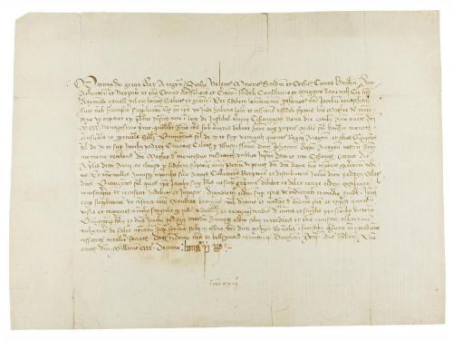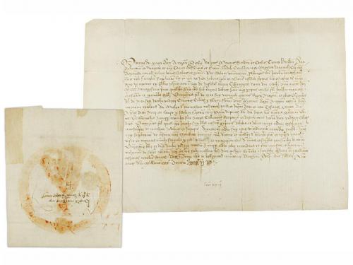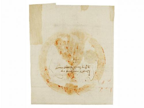 1410. MANUSCRITO. (BELLESGUARD-BARCELONA). MARTÍN EL HUMANO. Manuscrito sobre papel. Lleva restos del gran sello de lacre. El rey a Ramon sa Vall maestro nacional o a su lugarteniente: Jaume Tavascan, lugarteniente del protonotario, se ha quejado de que los recaudadores, receptores y distribuidores del peaje de Calatayud se niegan a pagarle los 500 sueldos barceloneses que Mateu de Monzón, escribano real, le cedió el 9 de octubre de 1391 en Julisbol (Zaragoza)- le cedió 1000 sueldos barceloneses censales, una mitad sobre el vectigal (un impuesto) del reino de Aragón y la otra sobre el peaje de Calatayud; Mateu, a su vez, había recibido esta cesión del rey Joan I el 8 de abril del mismo año en Zaragoza-, por la cual cosa el rey manda a su maestro racional que ponga remedio y que Jaume Tavascan cobre lo que se le debe. Firma del secretario.
