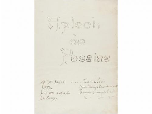 1902. MANUSCRITO. CUADERNILLO MANUSCRITO DE POESÍAS. Cuaderno de 20 h. en 4º menor. Manuscrito de la misma mano que al final se identifica como Josseph Anglada Sovenich, es un regalo dirigido a Dolores Villa. Reproduce poesías de Pitarra, Joan Manuel Casademunt y otros. Con falsas cubiertas de papel al agua, algo rozadas.