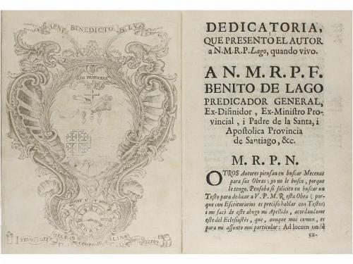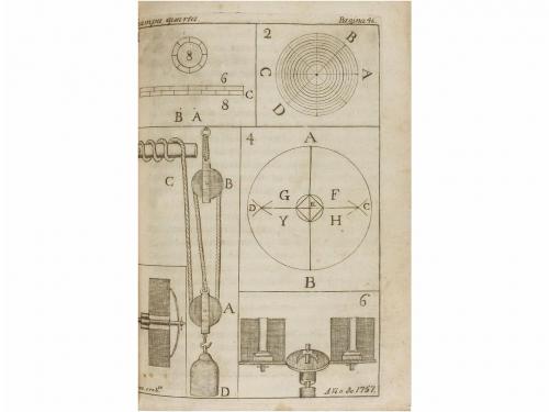1759. LIBRO. (GNOMÓNICA). RIO, MANUEL DEL:. ARTE DE RELOXES DE RUEDAS PARA TORRE, SALA, I FALTRIQUERA. Dividida en dos tomos, e iluminada con trece estampas...: lleva tambien las repeticiones, los diferentes calculos de todas las classes de rel. Santiago: Imp. Ignacio Aguayo, 1759. 2 vol. en 8º. I: Portada + frontis + 23 h. + 359 p. y 10 lám. (1 de ellas plegada). II: 198 p.+ 50 p. y 3 lám. Este segundo vol. algo corto de margen superior. Los grabados calcográficos firmados "Jacobo de la Piedra, en Santiago en el Año de 1757" . Enc. pasta española con leves roces en los planos, lomeras cuajadas, nervios, doble tejuelo, cortes pintados. Algunas h. levemente tostadas o con antiguo cerco. Las dos portadas y alguna lámina restauradas y la primera portada con pequeña reconstrucción en el margen interior. PRIMERA EDICIÓN de esta obra extraordinaria de relojería mecánica, donde este arte de precisión encuentra una justa descripción y arroja luz sobre su anatomía además de aportar cálculos de todas clases para su confección y mejor diseño. CCPB 64349-1. Palau 268231.