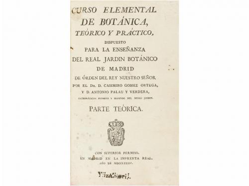 1785. LIBRO. (CIENCIAS-BOTÁNICA). GOMEZ ORTEZA, CASIMIRO; PALAU Y VERDERA, ANTONIO:. CURSO ELEMENTAL DE BOTÁNICA, TEÓRICO Y PRÁCTICO, dispuesto para la enseñanza del Real Jardin Botánico de Madrid... Madrid: Imp. Real, 1885. 2 tomos en un vol. en 8º. 6 h. + 226 p. + 2 h. + XL + 184 p. Cabeceras y culs-de-lampe xilografiadas. A pesar de un intermitente cerco de humedad, buen ejemplar. Enc. en plena piel, nervios, lomera y planos con hierros dorados. Exlibris de anterior poseedor. Palau 104236. CCPB 140663-9.
