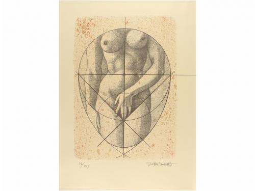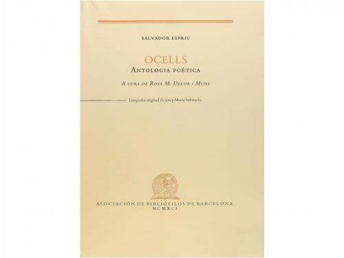 1991. LIBRO. (BIBLIOFILIA-GRABADOS). ESPRIU, SALVADOR; SUBIRACHS [ilustr.]:. OCELLS. ANTOLOGIA POÈTICA. A cura de Rosa M. Delor i Muns. Barcelona: Asociación de Bibliófilos de Barcelona, 1991. Folio. 92 p. Con una litografía, en Frontis, de Josep Maria Subirachs, numerada y firmada a lápiz por el artista. Ejemplar de la tirada de 125 sobre papel de hilo, numerados y nominados, de un total de 176. [Más:] MASSO TORRENTS, JAUME: CROQUIS PIRINENCS. Id: Id, 1996. Folio. 158 p. + 1 h. Cabeceras y culs-de-lampe xilográficas de Oriol Maria Diví. Ambos en rama, intonsos, presentado en petaca. Ejemplar de la tirada de 130 sobre papel de hilo, numerados y nominados, de un total de 181.