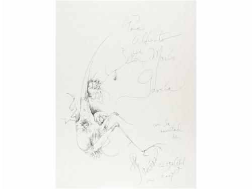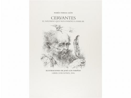 2006. LIBRO. (BIBLIOFILIA). LEÓN, MARÍA TERESA:. CERVANTES. EL SOLDADO QUE NOS ENSEÑÓ A HABLAR. Pamplona: Liber ediciones, 2006. Folio mayor. 196 p. + 12 dibujos de José Luís Fariñas, e ilustraciones en el texto. El texto ilustr. por el mismo artista con capitales y viñetas. En rama, presentado en funda y petaca de piel con hierro seco en el plano anterior. Ejemplar de los 75 numerados en romana que incluyen las doce estampas a color y otras doce en blanco y negro con gama de grises realizadas con las técnicas de arte digital y serigrafía, este ejemplar además lleva un dibujo original dedicado a D. Albert Marín, por el artista.