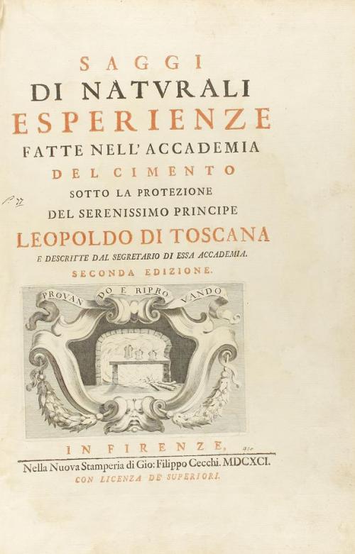 1691. LIBRO. (CIENCIAS). SAGGI DI NATURALI ESPERIENZE FATTE NELL'ACCADEMIA DEL CIMENO SOTTO LA PROTEZIONE DEL SERENISSIMO PRINCIPE LEOPOLDO DI TOSCANA. Firenze: nella nuova stamperia di Gio: Filippo Cecchi, 1691. Folio mayor. 8 h. + 1 retrato montado + CCLXIX p. + 9 h. Viñetas y abund. grabados a plena página. Amplios márgenes. Enc. en pergamino, leve roído en la esquina inferior.
