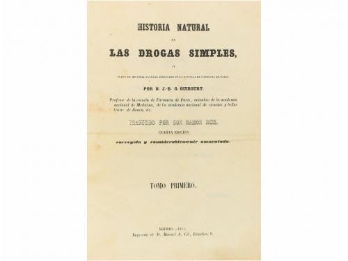 1851-1852. LIBRO. (MEDICINA). GUIBOURT, N. J.- B. G.:. HISTORIA NATURAL DE LAS DROGAS SIMPLES, Ó CURSO DE HISTORIA NATURAL ESPLICADO EN LA ESCUELA DE FARMACIA DE PARIS. Traducción de Ramón Ruiz. Madrid: Imp. D. Manuel A. Gil, 1851-1852. 3 vol. en 8º mayor. I: 496 p. II: 399 p. + 532 p. + 312 p. III: 249 p. Papel algo tostado. Profus. ilustr. con figuras en el texto. Cuatro tomos enc. en tres vol. en media piel y puntas, lomera cuajada, cortes pintados; rozada. Sello seco. Anotaciones de anterior poseedor. Palau 110711.