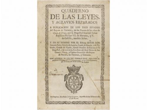 1744 ca. LIBRO. (NAVARRA-DERECHO). QUADERNO DE LAS LEYES Y AGRAVIOS REPARADOS A SUPLICACION DE LOS TRES ESTADOS DEL REYNO DE NAVARRA. en las Cortes de los años 1743 y 1744 por la Magestad Real del Seños Rey Don Felipe VII de Navarra y. Pamplona: Pedro Joseph Ezquerro impressor, s.a. 4º mayor. 2 h. + 233 p. + 4 h. (de 5) Portada en orla y con escudo xilográfico. Última hoja restaurada. Texto a dos columnas. Puntos de óxido. Enc. pergamino de época, lomera rotulada, restos de correíllas. Es primera edición, Palau cita una posterior, esta no la vio.