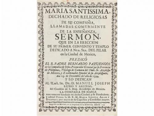 1755. FOLLETO. (SERMON). PAZUENGOS, BERNARDO:. MARIA SANTISSIMA, DECHADO DE RELIGIOSAS DE SU COMPAÑIA, LLAMADAS COMUNMENTE DE LA ENSEÑANZA, SERMON. QUE EN ERECCION DE SU PRIMER CONVENTO Y TEMPLO DEDICADO A Nra. Sra. DEL PILAR EN LA CIUDAD DE MEXIC. Mexico: Imp. de la Biblioteca, 1755. 8º. 31 p. Portada en orla xilográfica. Texto a dos columnas y con apostillas marginales. Falsas cubiertas de papel al agua, cortes jaspeados. Palau 215953.
