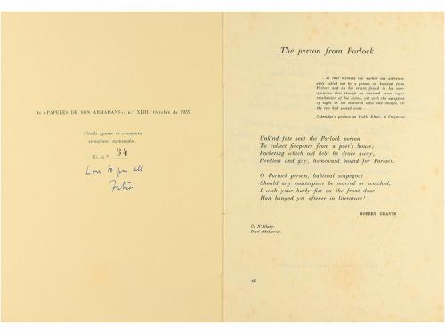 1959. FOLLETO. (SEPARATA-LITERATURA). GRAVES, ROBERT:. THE PERSON FROM PORLOCK. Versión castellana por C.J.C. (Camilo José Cela) autorizada por R. G. (Robert Graves). Madrid/ Palma de Mallorca: separata de "Papeles de son Armadans" nº XLIII, octubre 1959. 2 h. Con el facsímil litografiado del primer original manuscrito del poema. Rústica. Puntos de óxido. Tirada numerada de 50 ejemplares, con una nota manuscrita del autor.