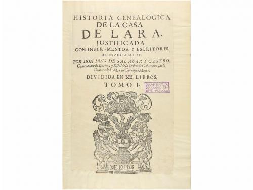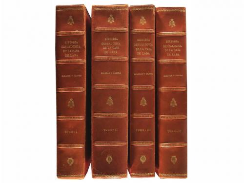 1694-1697. LIBRO. (GENEALOGÍA-HERÁLDICA). HISTORIA GENEALOGICA DE LA CASA DE LARA, JUSTIFICADA CON INSTRUMENTOS, Y ESCRITORES DE INVIOLABLE FE. Dividida en XX libros. Madrid: Imprenta Real: Por Mateo de Lianos y Guzman, 1694-1697. 4 vol. en folio. I (1696): 9 h. + 713 p. Portada laminada, numerosas remarginaciones y restauraciones, la mayoría en las primeras y últimas p., tenue cerco de humedad en la parte inferior de algunas p., mínimas faltas de papel en el margen inferior de las últimas p. II (1697): Portada + 891 p. Últimas p. restauradas y con mínimas pérdidas de papel en las puntas. III (1697): 586 p. [Más:] Id: PRUEBA DE LA HISTORIA DE LA CASA DE LARA, SACADAS DE LOS INSTRUMENTOS DE DIVERSAS IGLESIAS Y MONASTERIOS, Y DE LOS ARCHIVOS DE SUS MISMOS DESCENDIENTES, DE DIFERENTES PLEYTOS QUE ENTRE SI HAN SEGUIDO... 728 p. Todos los vol. con grabado xilográfico en portada, Cabeceras, capitales, escudos y culs-de-lampe xilografiados. Texto con apostillas marginales. Cuatro vol. enc. en plena piel granate con ruedas doradas en ambos planos y superlibris en el plano anterior, lomera con dorados, nervios; cantos ligeramente rozados. Algunas anotaciones manuscritas de antiguo poseedor, sello húmedo, exlibris de anterior poseedor. Completísima y rigurosa obra genealógica de las castas más poderosas de Castilla en la Baja Edad Media. Palau 286803. CCPB 40515-9, 40740-2, 40741-0. (PRUEBA DE LA HISTORIA DE LA CASA DE LARA no consta en CCPB).