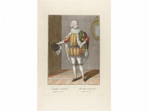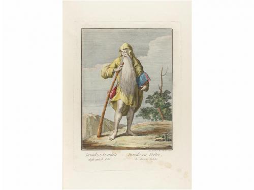 1780 ca. GRABADO. [RACCOLTA DI STAMPE CHE REPRESENTATO FIGURE E ABITI DI VARIE NEZIONE.]. 28 grabados de 28 x 20 cm de huella y 37 x 27 cm, papel. Todos realizados y firmados por Theodorum Viero Venetiis. Todos coloreados de época y con leyenda a pie identificando cada personaje, prácticamente todos españoles. Enc. en media piel, puntas, nervios y tejuelo. Ejemplar limpio sobre buen papel, alguna levísima sombra de óxido. El tejuelo reza: SPANISH COSTUMI.