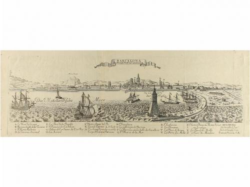1721 ca. GRABADO. (BARCELONA). [STRIDBECK, J.; BODENEHR, G.:]. BARCELONA DIE HAUPF STAFF IN CATALONIEN. Augsburg: 1721. Grabado al aguafuerte 16 x 50 cm, huella, 19 x 53 cm papel. Cat. Soley, 160.