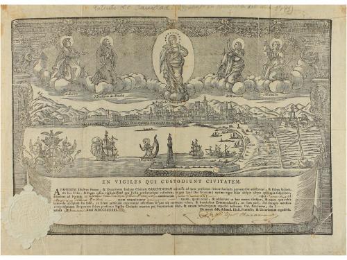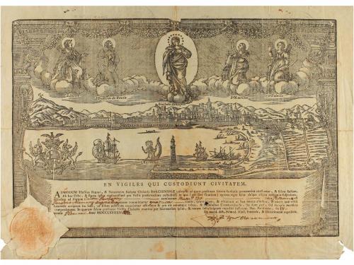 1791 Y 1794. GRABADO. (PATENTE). VALLS, IGNASI:. XILOGRAFÍA CON VISTA DE BARCELONA Y SU PUERTO MARÍTIMO. PATENTE DE SANIDAD. Dos documentos de patente de sanidad con la xilografía de Ignasi Valls. Conservan la oblea del sello seco. Ambas firmadas y tiradas sobre papel sellado, una recibe la autorización para seguir viaje a Francia, procedía de Peñíscola. La de 1794 recibe la autorización para seguir viaje, procedía de Tarragona. Señal de óxido, alguna rasgadura marginal.