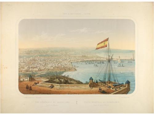 1865 ca. GRABADO. (BARCELONA). LEBRETON, LOUIS; TURGIS II [TURGIS JEUNE], L.:. VUE GÉNÉRALE DE BARCELONA/ VISTA GENERAL DE BARCELONA TOMADA DEL FUERTE DE MOJUICH. Paris/ New York: Ed. L. Turgis, 1865 ca. 31 x 48 cm imagen, 48,5 x 64 cm papel. Cromolitografía. Ligero cerco de humedad apreciable al dorso. Cat. Soley 544.