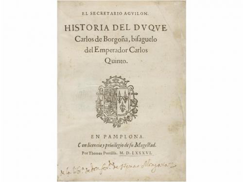 1586. LIBRO. (HISTORIA). AGUILON, EL SECRETARIO:. HISTORIA DEL DUQUE CARLOS DE BORGOÑA, BISAGUELO DEL EMPERADOR CARLOS QUINTO. Pamplona: Imp. Thomas Porralis, 1586. 8º mayor. 4 h. + 205 p. + 1 grabado xilográfico del biografiado a caballo. En la portada lleva el escudo tipográfico de Porralis. Ocasional cerco de humedad en el margen. Enc. en pergamino. Palau 3856. CCPB 119320-1.