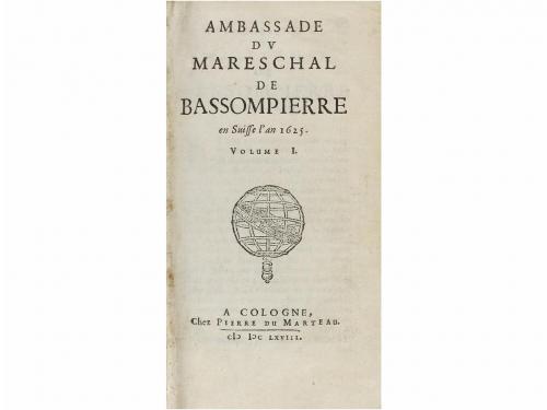 1668. LIBRO. (HISTORIA). AMBASSDE DU MARESCHAL BASSOMPIERRE EN SUISSE L'AN 1625. Cologne: Chez Pierre du Marteau, 1668. 2 vol. en 8º menor. I: 1 h. + 388 p. (aunque impreso 188)+ 269 p. II: 1 h. + 363 p. (aunque impreso 163) + 1 h. 316 p. La obra está dividida en cuatro tomos, cada uno con portada propia. Cuatro tomos enc. en dos vol. en pasta española, nervios, cortes pintados, rozada. Primera edición de estos informes del embajador Bassompierre, en misiones diplomáticas en España, Suiza e Inglaterra.