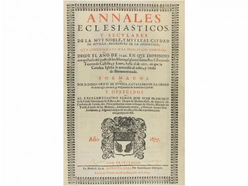 1677. LIBRO. (HISTORIA-RELIGIÓN). ORTIZ DE ZÚÑIGA, DIEGO:. ANNALES ECLESIASTICOS Y SECULARES DE LA MUY NOBLE Y MUY LEAL CIUDAD DE SEVILLA... que contienen sus mas principales memorias desde el año de 1246 en que emprendio conquistarla ... S. Fernando Tercero. Madrid: En la Imp. Real por Iuan Garcia Infançon, 1677. Frontis + 12 h. + 817 p. + 8 h. Error de paginación de la p. 375 salta a la 378. Portada a dos tintas con escudo nobiliario xilográfico, primeras páginas orladas. Bello frontispicio calcográfico en alegoría a la ciudad por Marcus Orozco Presbyer. Cabeceras, capitales y culs-de-lampe xilográficas; viñetas calcográficas en el texto. Texto a dos columnas y con apostillas marginales, algún tenue cerco de humedad; última página restaurada. Enc. en pergamino moderno, lomera rotulada, cortes jaspeados. Diego de Zúñiga realizó un métódico trabajo de investigación dando lugar a esta magnífica obra de historia hispalense, que dedicó a Juan Francisco de la Cerda, VIII Duque de Medinaceli. Palau 206132; CCPB 40893-X.