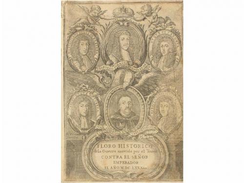 1684-1688. LIBRO. (HISTORIA EUROPA). FABRO BREMUNDAN, FRANCISCO:. FLORO HISTORICO DE LA GUERRA MOVIDA POR EL SULTAN DE LOS TURCOS MEHEMET IV. Contra el augustissimo Leopoldo Primero, emperador de los romanos, en el año MDCLXXXIII. Traducido de Italiano... Madrid: Imp. de Bernardo de Villa Diego [para el vol. I, 1684]-Imp. Antonio Roman [para el Vol. II, 1687 y III, 1688]. 3 vol. en 8º mayor. I: Frontis calcográfico por Fosman + 8 h. + 67 fol. Frontis laminado; alguna rasgadura marginal y último fol. restaurado. II: TERCERA PARTE. Frontis calcográfico por I. F. Leonardo + 8 h. + 252 p. Señales de óxido, dos hojas en pliego desprendidas. III: QUARTA PARTE. 8 h. + 224 p. Algunas p. tostadas, señales de óxido. Cabeceras, capitales y culs-de-lampe xilografiadas. Tres vol. enc. en pergamino de época. Vol. I: enc. parcialmente desprendida. Vol. II: enc. con mínima pérdida en el corte superior, algo mareado y anotaciones manuscritas de antiguo poseedor en la guarda. Presentamos 3 vol. pertenecientes a la primera, tercera y cuarta parte. Palau 86152; 86156; 46157.