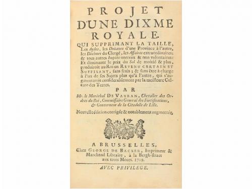 1709. LIBRO. (HISTORIA-ECONOMÍA). VAUBAN, DE:. PROJET D'UNE DIXME ROYALE Qui supprimant la taille. Brusselles: Chez George de Backer, 1709. 8º. 5 h. + 199 p. + 16 h. 3 estados plegados. Portada con xilografía tipográfica. Cabeceras, capitales y culs-de-lampe xilografiadas. Texto con apostillas marginales. Enc. en pasta española ligeramente rozada; nervios, tejuelo y cortes pintados. Anotaciones de anterior poseedor, sello húmedo.