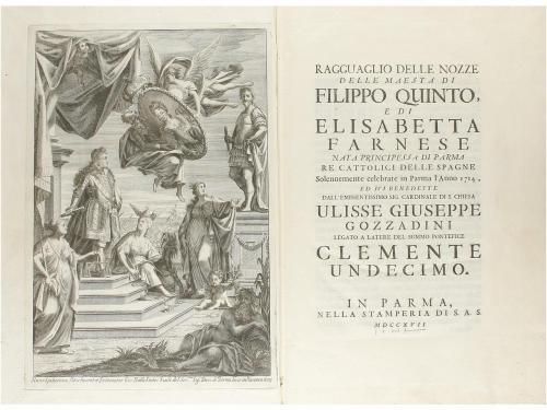 1717. LIBRO. (HISTORIA-MONARQUÍA). RAGGUAGLIO DELLE NOZZE DELLE MAESTA DI FILIPPO QUINTO, E DI ELISABETTA FARNESE NATA PRINCIPESSA DI PARMA, RE CATTOLICI DELLE SPAGNE. SOLENNEMENTE CELEBRATE IN PARMA L'ANNO 1714. Parma: Nella Stamperia di S. A. S., 1717. Folio menor. Gran frontis alegórico grabado + 115 p. + 5 grandes láminas grabadas, plegadas. Enc. en pasta española, nervios, lomera decorada con flores de lis doradas, cortes jaspeados. Grandes márgenes, recio y grueso papel. Las láminas fueron grabadas por Teodoro Verecruise y F.M. Francia Bonom y representan: el gran desfile que supuso la entrada en la ciudad de los invitados y el monarca, la fachada del Duomo de Parma, el interior del de la catedral, el coro con todos los personajes y finalmente la planta de la catedral de Parma. Edición bellísima y en buen estado de conservación. Palau 246192.