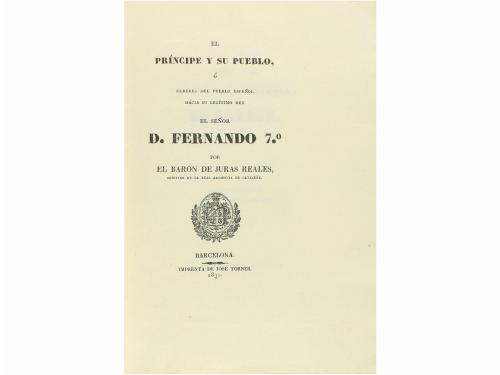 1830. LIBRO. (HISTORIA). EL PRÍNCIPE Y SU PUEBLO, Ó DEBERES DEL PUEBLO ESPAÑOL HÁCIA SU LEGÍTIMO REY EL SEÑOR D. FERNANDO 7º POR EL BARON DE JURAS REALES, MINISTRO DE LA REAL AUDIENCIA DE CATALUÑA. Barcelona: Imp. José Torner, 1830. 4º menor. 3 h. + 1 grabado + 139 p. Impreso sobre papel de hilo, falsas cubiertas. Pequeña mancha en el margen inferior de la lámina.