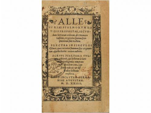 1523-1524. LIBRO. (RELIGIÓN). LUSCINIO ARTENTINO, OTTOMARO:. ALLEGORIAE PSALMORUM DAVIDIS PROPHETAE, secindum literarum ordinem ad... Germania Augustam: S. Imp., 1523. 8º. 46 h. [Sign. a8-e8 + f6]. Portada con orla xilográfica, remarginada, con pequeña pérdida de papel, sello húmedo y anotación manuscrita de antiguo poseedor. [Sigue:] PLECTRA IN SINGULOS PSALMOS DAVIDIS, sive rerum argumenta... Ex coenobio S. Udalrici: S. Imp, 1524. Id. 70 h. [Sign. A2 + B8-H8 + I4 + K8]. [Sigue:] PSALTERIUM DAVIDIS REGIS PROPHETE... Id. 67 h. [Sign. A8-G8 + H4 + I7]. Portada con orla arquitectonica xilografiada. Ilustr. con bellas capitales xilografiadas. Tenue cerco de humedad en la primera parte de la obra. Enc. en pargamino moderno.