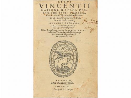 1570. LIBRO. (HUMANIDADES). FERRER, VICENTE:. BEATI VINCENTII NATIONE HISPANI...SERMONES HYEMALES: Auctoris vitam, indicemque locupletissimum in fronte libri praefiximus... Antuerpiae: Apud Philippum Nutium, 1570. 8º menor. 16 h. + 752 p. Portada con xilografía tipográfica. Capitales.Texto con apostillas marginales. Tenue cerco de humedad. Enc. en pleno pergamino de época ligeramente mareado y parcialmente desprendido, lomera rotulada. Anotaciones manuscritas de antiguo poseedor. CCPB 1581-4.