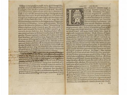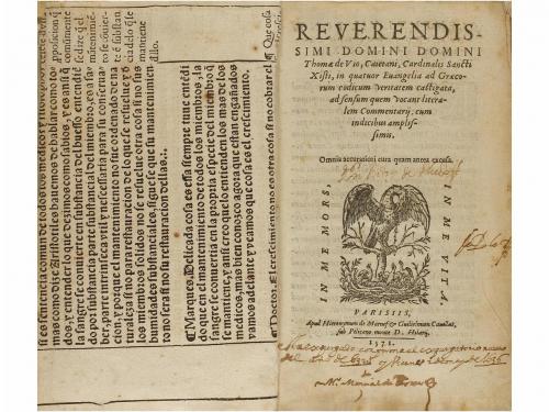 1571. LIBRO. (HUMANIDADES). VIO CAIETANI, THOMAS DE:. REVERENDISSIMI DOMINI Thomae de Vio, Caietani, Cardinalis Sancti Xissi, in quartor evangelia... Parisiis: Apud Hieronymum de Marnes & Guilielman Cauellas, 1571 en portada [en colofón 1546]. 8º. 24 h. + 503 fol. Portada con grabado tipográfico. Bellas capitales xilografiadas. Texto con apostillas marginales manuscritas de época. Enc. en pleno pergamino de época algo mareado, lomera rotulada; reutilización de antiguas hojas impresas en letra gótica para las guardas, con faltas. Anotaciones de anterior poseedor.