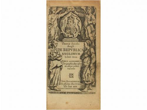 1630. LIBRO. (HUMANIDADES). SMITHI ANGLI, THOMAE:. DE REPUBLICA ANGLORUM. Libri tres. Lug. Batavorum: Ex officina Elzeviriana, 1630. 12º. 6 h. + 404 p. + 6 h. Portada calcográfica. Cabeceras, capitales. Enc. en pleno pergamino de época, cortes pintados; cajo sesgado.
