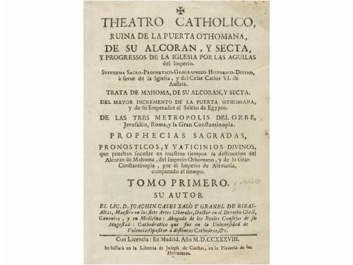 1738. LIBRO. (RELIGIÓN). CASSES XALÓ Y GRANEL DE RIBAS ALTAS, JOACHIN:. THEATRO CATHOLICO, ruina de la puerta othomana de su alcoran, y secta, y progressos de la iglesia por las aguilas del Imperio... Madrid: Libr. Joseph de Cueñas, 1738. 8º mayor. 20 h. + [falto de la p. 1, sig. A1 y p. 211, sig. Dd2 ] 211 p. + 6 h. Cabeceras y capitales xilografiadas. Texto con apostillas marginales. Falta de papel de la h. 1, sig. Dd3. Enc. en pergamino de época, algo mareada, lomera rotulada; pequeña falta en el plano posterior. Anotaciones de anterior poseedor. Palau 47406.
