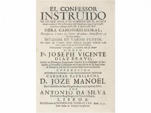 1757. LIBRO. (RELIGIÓN). DIAZ BRAVO, JOSEPH VICENTE:. EL CONFESSOR INSTRUIDO EN LO QUE TOCA A' SU COMPLICE EN EL PECADO TORPE CONTRA EL SEXTO PRECEPTO del decalogo, segun las constituciones ultimas de N. SS. P. Benedicto XIV. Lisboa: Officina de Domingos Gonsalves, 1757. 8º mayor. 8 h. + 240 p. Enc. en media piel reciente, tejuelo, nervios .