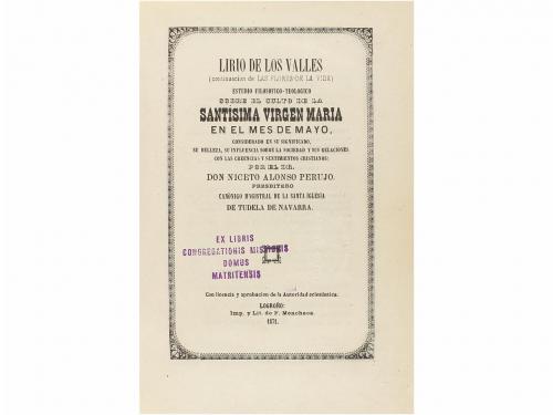 1871. LIBRO. (MARIANISMO). ALONSO PERUJO, NICETO:. LIRIO DE LOS VALLES (CONTINUACIÓN DE LAS FLORES DE LA VIDA) ESTUDIO FILOSOFICO-TEOLOGICO SOBRE EL CULTO A LA SANTÍSIMA VIRGEN MARIA EN EL MES DE MAYO. Logroño: Imp. F. Menchaca, 1871. 8º mayor. XV +358 p. + 1 h. Texto en orla y cromolitografía a modo de frontis. Enc. en media piel, planos algo deslucidos.