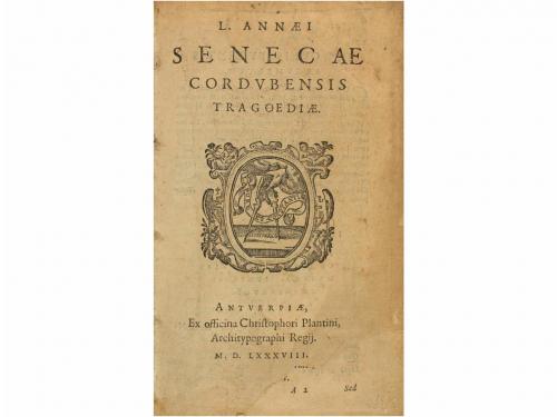1588. LIBRO. (LITERATURA CLÁSICA). SENECA, LUCIO ANNEO:. L. ANNAEI SENECAE CORDUBENSIS TRAGOEDIAE. Auterpiae: Ex officina Christophori Plantini, 1588. 8º mayor. 454 p. + 1 h. Capitales xilografiadas. Algunas hojas ligeramente tostadas. Portada con xilografía tipográfica, falta de papel en la punta inferior, sin afectar texto. Enc. en pleno pergamino de época. Anotaciones manuscritas de antiguo poseedor.