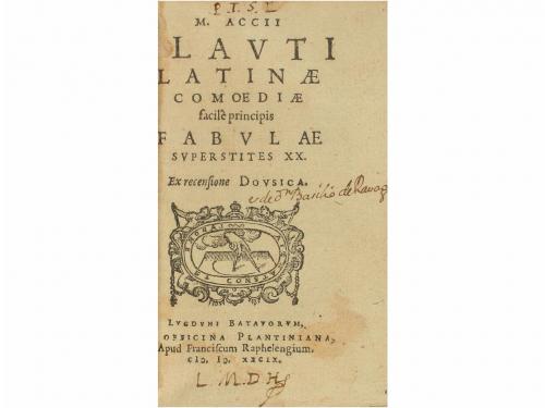 1589. LIBRO. (LITERATURA CLÁSICA). PLAUTUS, TITUS MACCIUS:. M. ACCII PLAUTI LATINAE COMOEDIAE facile principis fabulae superstites XX... Lugduni Batavorum: Ex officina Plantiniana, Apud Franciscum Raphaelengium, 1589. 12º. 869 p. + 4 h. Texto con apostillas marginales; alguna leve manchita. Enc. en pleno pergamino de época, lomera rotulada, cortes pintados; mínima falta en el cajo posterior. Anotaciones manuscritas de anterior poseedor.