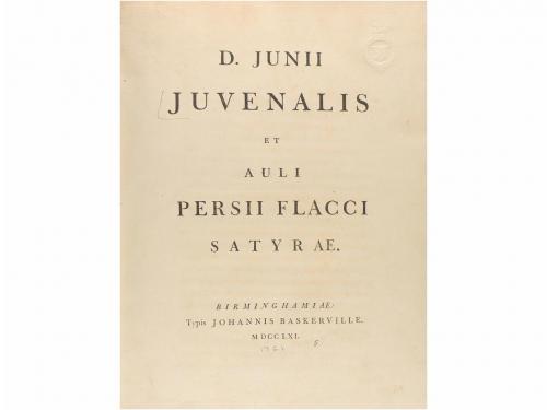 1761. LIBRO. (LITERATURA CLÁSICA). DECIO JUNIO, JUVENAL:. JUNII JUVENALIS ET AULI PERSII SATYRAE. Birmingham: Johannis Baskerville, 1761. Folio menor. 240 p. Márgenes amplios. Algún punto de óxido y tenue cerco de humedad al final. Enc. en pasta española, muy rozada, cajos parcialmente desprendidos. Pulida y temprana impresión de Baskerville. Pequeñas anotaciones a lápiz. Sello seco de una librería de Leicester, exlibris de anterior poseedor. CCPB 312669-2.