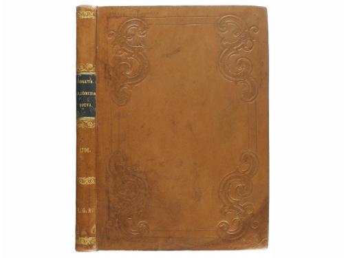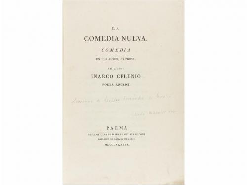 1796. LIBRO. (LITERATURA). CELENIO, INARCO [LEANDRO FERNÁNDEZ DE MORATÍN:]. LA COMEDIA NUEVA EN DOS ACTOS, EN PROSA. Parma: Oficina de Juan Bautista Bodoni impresor de cámara de S. M. G., 1796. 4º menor. 6 h. + 128 p. Buen papel, amplios márgenes. Enc. en plena piel de época con gofrados en ambos planos, tejuelo, cortes pintados. Palau 59322, dice que es bella edición en papel fuerte producto de las famosas prensas bodonianas y modelo de ejecución tipográfica. Se trata de la única obra publicada por Bodoni íntegramente en castellano.