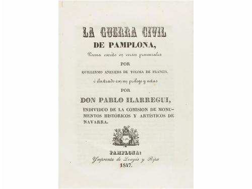 1847. LIBRO. (NAVARRA-POESIA). ANELIERS DE TOLOSA DE FRANCIA, GUILLERMO:. LA GUERRA CIVIL DE PAMPLONA. Poema escrito en versos provenzales por... é ilustrado con un prólogo y notas por Don Pablo Ilarregui... Pamplona: Imp. de Longás y Ripa, 1847. 4º menor. 183 p. Grabado tipográfico en portada. Anchos márgenes; esporádicos puntos de óxido. PRIMERA EDICIÓN. Enc. en media piel de época, algo rozada.