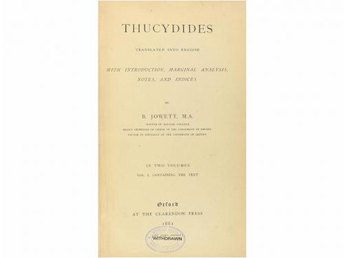 1881. LIBRO. (LITERATURA CLÁSICA). JOWETT, B.:. THUCYDIDES. Translated into english with introduction, marginal analysis, notes, and indices by... Oxford: At the Clarendon Press, 1881. 2 vol. en 4º menor. I: XX + 708 p. II: LXXXVIII + 550 p. + 1 h. Texto con apostillas marginales. El vol. I con pequeña manchita de tinta en las pp. 118-119 y mínima restauración marginal. Dos vol. enc. en tela verde. Exlibris y sello húmedo de anterior poseedor. Buen ejemplar.