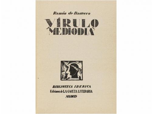 1926. LIBRO. (LITERATURA-VANGUARDIAS). BASTERRA, RAMÓN DE:. VÍRULO MEDIODIA. Madrid: Ed. de la Gaceta Ibérica, Biblioteca Ibérica, 1926. 8º menor. 76 p. + 2 h. Obra pionera sobre el concepto de hispanidad del siglo XX. PRIMERA EDICIÓN. Enc. en plena piel azul, ambos planos enmarcados con hierros dorados, lomera cuajada; conserva las cubiertas originales. Perfecto estado.