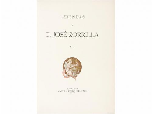 1901. LIBRO. (BIBLIOFILIA). ZORRILLA, JOSÉ:. LEYENDAS DE... Madrid: Ed. Manuel Pedro Delgado, 1901. 2 vol. en gran folio. I: 1 retrato + LXIV p. + 237 p. + 4 h. II: 256 p. + 2 h. Ilustr. con un retrato grabado de J. Zorrilla dibujado por Antonio Mª Esquivel y grabado por Bartolomé Maura, en 1842. Profus. ilustr. con numerosas lám. en b/n y color por Ferrant, Jimenez Aranda, Maura, Mélida, Pla, Sala, Simonet, Sorolla, Unceta, Urrabieta Vierge. Dos. vol. enc. tela firmada por E. Domenech con los planos anteriores decorados por Mélida, lomera de piel decorada con hierros dorados. Publicada bajo la dirección artística de Don José Ramón Mélida y un prólogo de D. Jacinto Octavio Picón. Palau 380780.