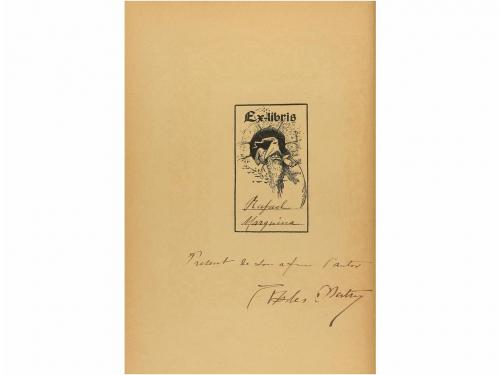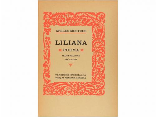 1907. LIBRO. (BIBLIOFILIA). MESTRES, APELES:. LILIANA. Traducció castellana per J. M. Arteaga Pereira. Vilanova i la Geltrú: Estampat per Oliva, 1907. 4º mayor. 282 p. + 2 h. Ilustr. con bellas lám. y viñetas grabadas sobre madera por el autor. Enc. en tela, corte superior dorado, tejuelo. Exlibris de anterior poseedor. Dedicatoria autógrafa. Palau 166746. [Más:] VERDAGUER, JACINTO. CANIGÓ. LLEGENDA PYRENAYCA DEL TEMPS DE LA RECONQUESTA. Vich: Ed. Sala, 1945. 8º mayor. 178 p. Ilustr. por J. Junceda, con láminas fuera del texto. En rústica y carpeta de cartoné en petaca rozada. Edición impresa en motivo del centenario del nacimiento del poeta; tiraje de 150 ejemplares numerados en romana con las lám. iluminadas a mano, firmados por el artista.