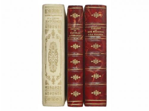 1925. LIBRO. (COLECCIÓN BIBLIÓFILO). IRIARTE, TOMÁS DE:. FÁBULAS LITERARIAS. Madrid: Librería de los Bibliófilos Españoles, 1925. 12º. 3 h. + XX + 188 p. + 2 h. Ilustrado con un retrato del autor grabado por José Torné y 24 ilustraciones en el texto de José Longoria. Edición de 500 ejemplares en papel de hilo. Enc. en plena piel, hilos dorados en ambos planos, nervios, corte superior dorado, conserva las cubiertas de rústica original estampadas en dorado. [Más:] CADALSO, JOSÉ: LOS ERUDITOS A LA VIOLETA. id., 1928. XL + 327 p. + 2 h. Ilustrado por José Triadó. Eidición numerada de 500 ejemplares sobre papel de hilo. Enc. en plena piel, hilos dorados, nervios, conserva las cubierta originales estampadas en dorado. [Más:] GOMEZ DE AVELLANEDA, GERTRUDIS y CASTRO, ROSALIA DE: ANTOLOGIA. Prólogo y selección de Fernando Gutiérrez. Barcelona: Montaner y Simón, 1945. 188 p. Enc. en pergamino decorado con dorados en ambos planos, lomera cuajada, corte superior dorado. Edición numerada de 33 ejemplares.