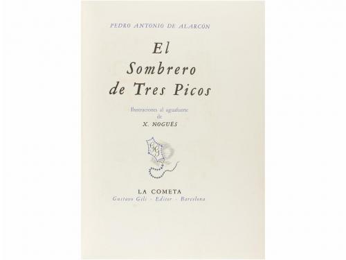 1934. LIBRO. (ENCUADERNACIÓN-BIBLIOFILIA). ALARCON, PEDRO ANTONIO:. EL SOMBRERO DE TRES PICOS. Ilustr. al aguafuerte de X. Nogués. Barcelona: La Cometa, Gustavo Gili, 1934. 4º. 232 p. + 2 h. Ilustr. en texto y lám. Magnífica enc. en plena piel verde con hilos dorados y pequeños mosaicos, corte superior tintado y cincelado, en el verso de ambos planos dos grandes mosaicos reproduciendo los figurines de Picasso de los protagonistas, guardas de seda; sobrecubierta en media piel con hilos dorados y papel al agua, presentado en petaca. Edición en papel de hilo de la tirada de 223 ejemplares, de un total de 266. Palau 4671.