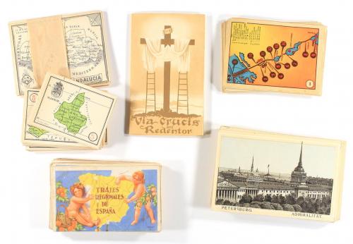 1900 ca. CROMOS. LOTE DE VARIAS COLECCIONES DE CROMOS, COMPLETAS O CASI COMPLETAS. MUCHAS DE REGIONES DE ESPAÑA. Contiene varias colecciones de la geografía española (por comarcas, comunidades, trajes regionales...), alguna serie religiosa, una serie fotográfica de Viñas y Compañía de las principales ciudades del mundo,la serie de Chocolate Amatller de Jefes de Estado de España (no completa), un juego de cartas con las regiones de España (completo, conserva la caja original y la hoja de intruccioines) y series A a F de Chocolates de A. Soler y Alsina "Rusia y Japón", incompleta y con alguno repetido.