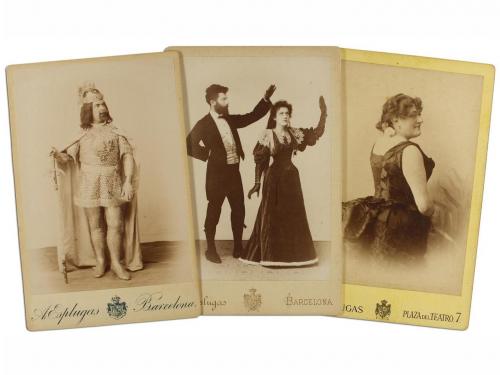 1880-1910. FOTOGRAFÍA. (RETRATO). ESPLUGAS, A.:. CONJUNTO DE 35 FOTOGRAFÍAS. Conjunto de 35 retratos fotográficos, 14,5 x 10 cm. Todos montados sobre cartoné, con el anagrama del estudio de Esplugas al dorso, varios son retratos de personajes teatrales caracterizados o de variedades.
