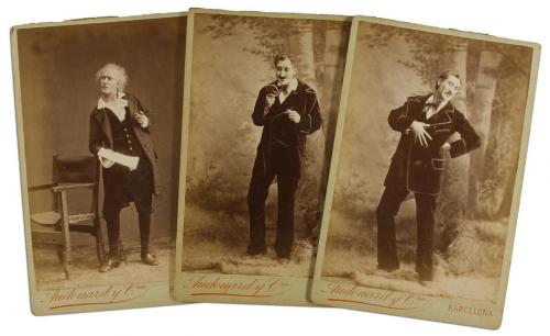 1890 ca. FOTOGRAFÍA. (TEATRO). AUDOUARD:. CONJUNTO DE 19 RETRATOS FOTOGRÁFICOS. Lote de 19 fotografías montadas sobre cartoné (14,5 x 10 cm). Con anagrama del fotógrafo al dorso y en el papel protector que muchas aún conservan. Retratos de actores de teatro caracterizados .