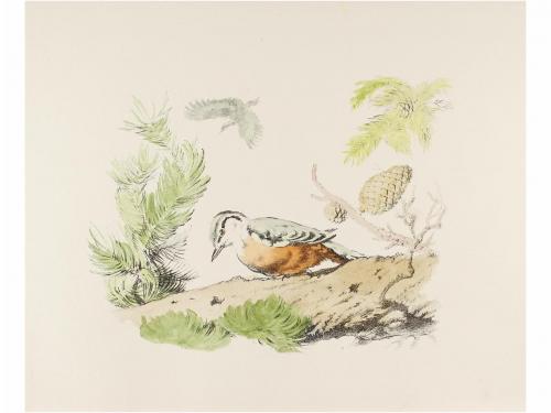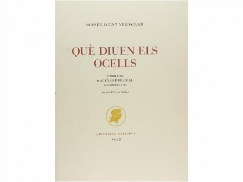 1945. LIBRO. (BIBLIOFILIA). VERDAGUER, JACINT:. QUÈ DIUEN ELS OCELLS. Litografies d´Alexandre Coll acolorides a mà. Revisió d´Alfred Gallart. Barcelona: Editorial Casiopea, 1945. Folio. III + 162 p., 2 h., 16 litografías en color, viñetas a una tinta. Edición numerada y limitada a 360 ejemplares. Singular conjunto de poesías y poemas en prosa, dedicadas a los pájaros, con las que el poeta interpreta la letra de sus cantos. Espléndida edición, publicada en conmemoración del centenario del gran escritor, con hermosísimas litografías a todo color, bonitas viñetas a una tinta, y texto a dos tintas. Prólogo de Antonio Julià de Capmany. Encuadernación original en rústica y petaca editorial.