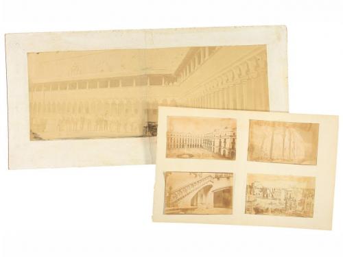1890 ca. FOTOGRAFÍA. (BARCELONA). 12 FOTOGRAFÍAS SOBRE PAPEL ALBUMINADO DE LUGARES DE BARCELONA. Todas 5,5 x 9,9 cm excepto una en la que aparece retratado un grupo de hombres y niños en un claustro, de 12 x 33 cm. Esta última fotografía con antigua mancha de tinta.
