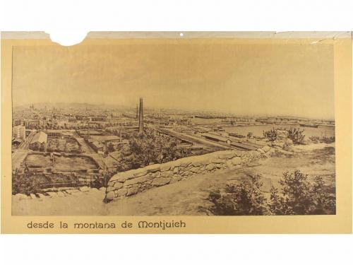 1905. FOTOGRAFÍA. (BARCELONA). VISTA PANORÁMICA DE BARCELONA, TOMADA DESDE LA MONTAÑA DE MONTJUICH. Fotografía realizada en dos grandes hojas de 29 x 54,5 cm y 29 x 63 cm. Firmada en el cliché así "F. Xumetra retocó 1905." Alguna rasgadura periférica.