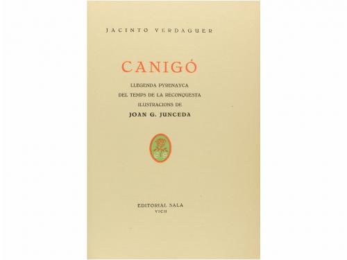 1945. LIBRO. (LITERATURA CATALANA). VERDAGUER, JACINTO. CANIGÓ. LLEGENDA PYRENAIYCA DEL TEMPS DE LA RECONQUESTA. Vich: Ed. Sala, 1945. 8º mayor. 178 p. Ilustr. por J. Junceda, con láminas fuera del texto. En rústica y carpeta de cartoné en petaca rozada. Edición impresa en motivo del centenario del nacimiento del poeta; tiraje de 150 ejemplares numerados en romana con las lám. iluminadas a mano, firmados por el artista.