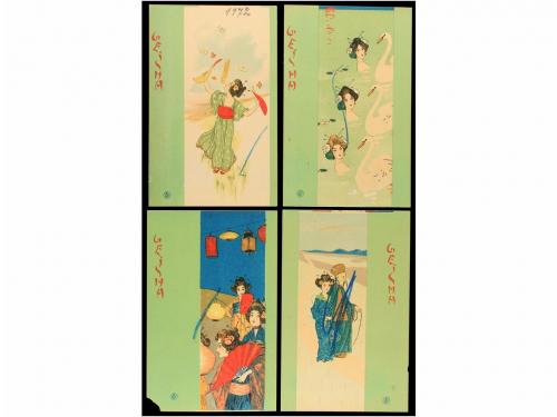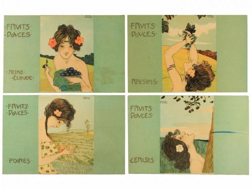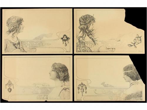 1900 CA. POSTALES. (MODERNISMO). LOTE DE UNAS 150 POSTALES MODERNISTAS. Montadas en un álbum varias series completas de artistas como Nini Hager, Raphael Kirchner, Kierz o Carl Jozsa, entre otros. Muchas presentan una raya azul, algunas han perdido una esquina. Preferible examinar.